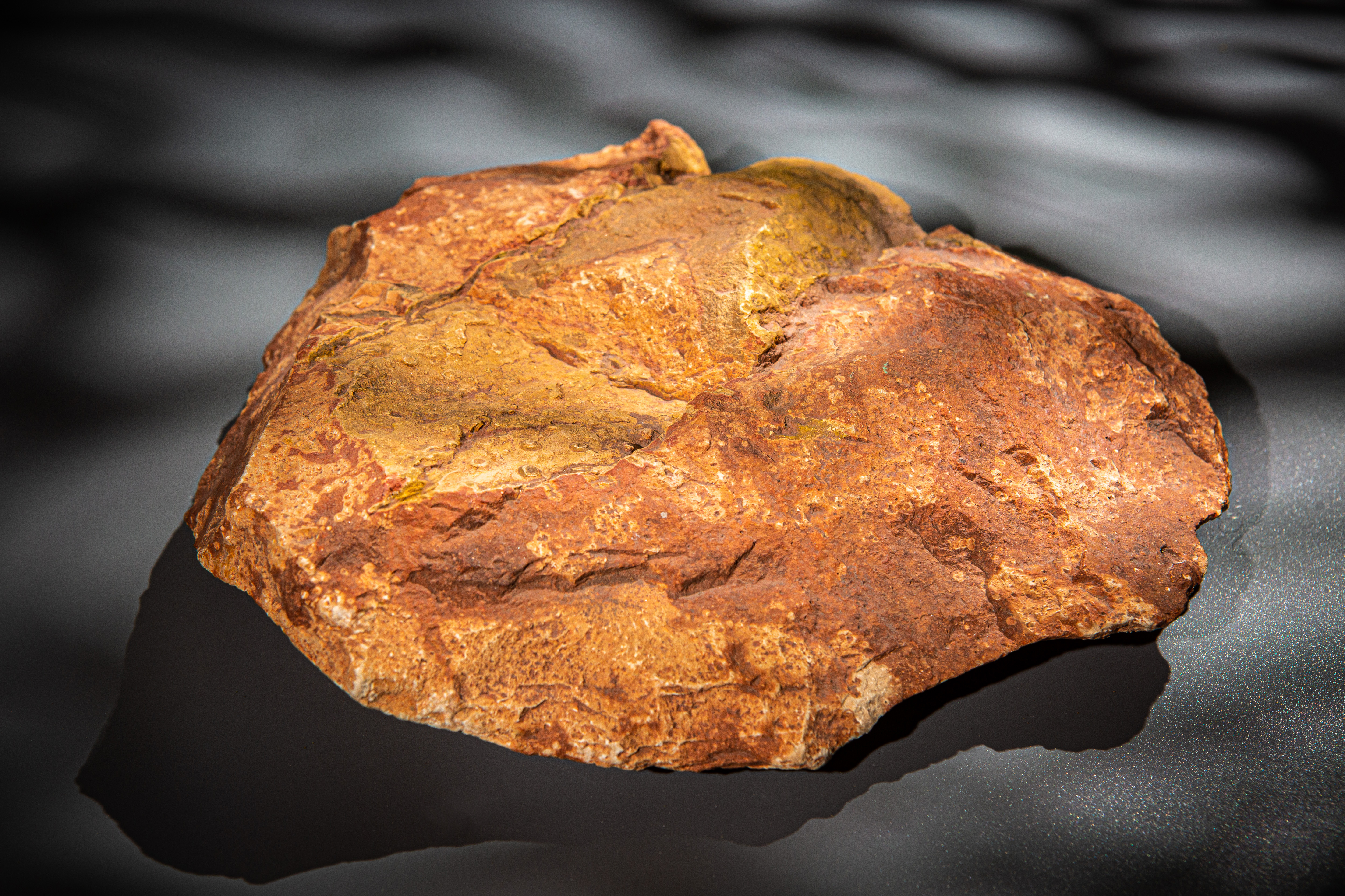 Подобные руды формировались в тропическом климате миллионы лет назад. В данном образце виден отпечаток древнего тропического растения — лепидодендрона.